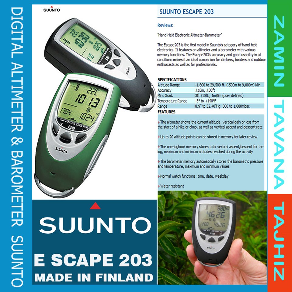 The Suunto Escape203 is an electronic hand-held watch-altimeter-barometer instrument with a memory. The Escape203's accuracy and good usability in all conditions makes it an ideal companion for climbers, boaters and outdoor enthusiasts as well as for professionals.